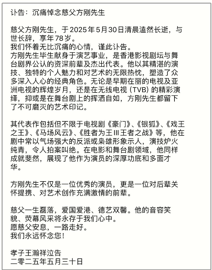 方刚一生未婚未育,没有儿女,5月30日其义子王瀚祥发布讣告。