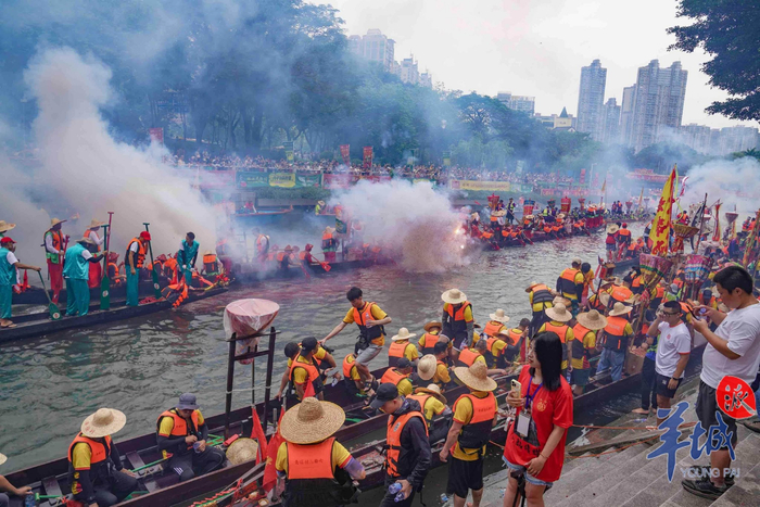 冼村、石牌、潭村等周边村的龙舟陆续抵达,鞭炮炸响百舸争流,龙舟为媒续千年情谊