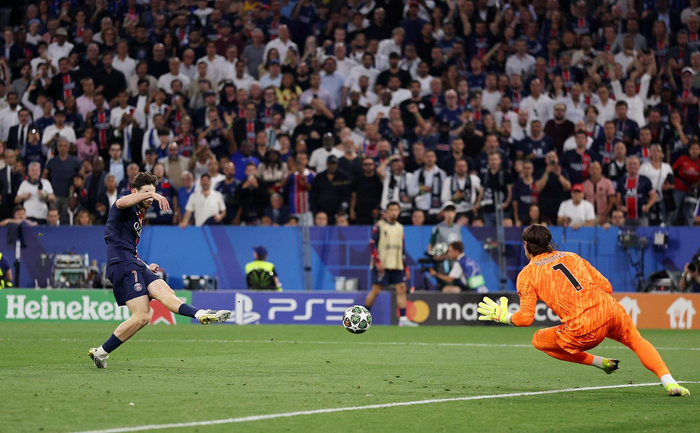 开场仅12分钟,维蒂尼亚直传穿透国米防线,杜埃在门前冷静横传,右后卫阿什拉夫轻松推射得分。阿什拉夫是2021年从国米加盟大巴黎的,当时以6800万欧元的转会费成为身价最高的边后卫,攻破老东家球门之后,他举起双手拒绝庆祝。