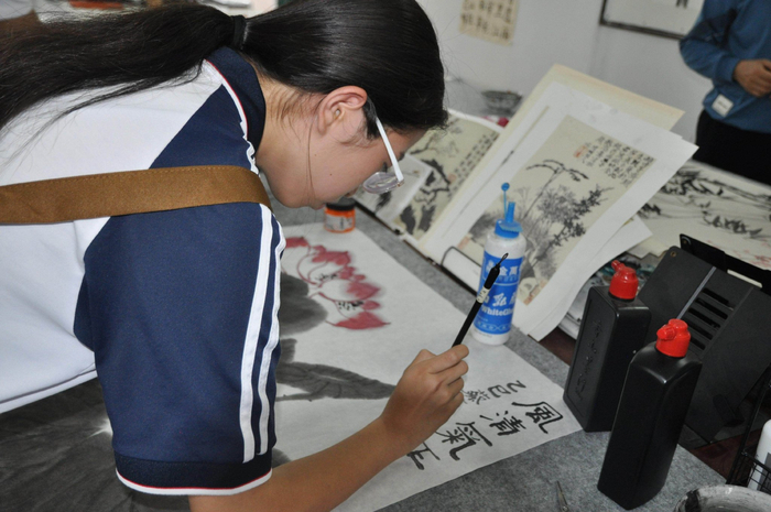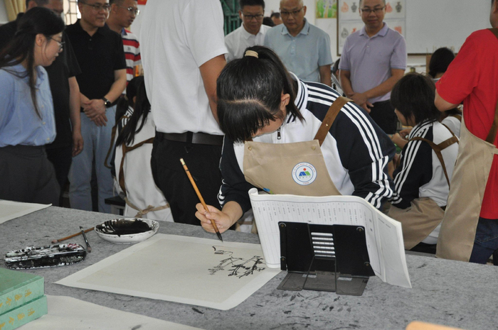 学生在美育课堂上进行书画创作非遗美育课堂上,驻镇工作队队员、爱心企业家们与绵基中学教师及陶艺、国画社团的学生们一起参加了陶艺体验活动。在陶艺体验环节,学生们通过手捏成型、泥条盘筑和拉坯机操作,制作出小杯、笔筒等创意作品;传拓体验中,师生们利用现有陶艺作品制作拓片,感受古老技艺的魅力;水墨画创作则让大家在笔墨交融中感悟传统艺术精髓。学生们还使用文房四宝,创作了以莞揭合作、揭西山水、乡村振兴为主题的国画、书法作品。学校师生还向企业家们赠送了学生陶艺作品作为纪念。