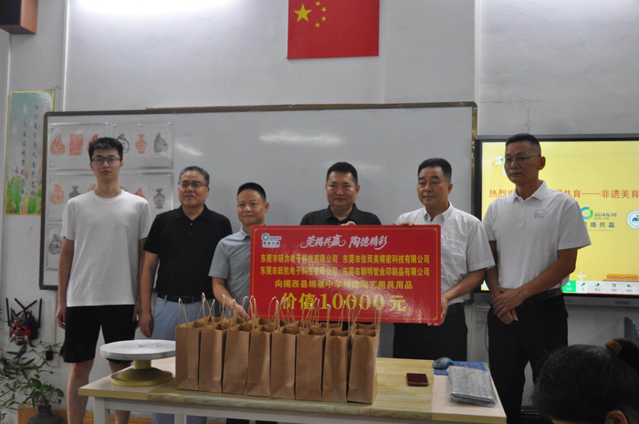 东莞市爱心企业向学校捐赠陶艺用具和体育器材为进一步完善绵基中学教育设施,驻镇工作队发动、组织爱心企业与热心人士,分别向学校捐赠一批美育课堂用品和体育器材。东莞市链力电子科技有限公司、东莞市佳而美精密科技有限公司、东莞市跃凯电子科技有限公司、东莞市朝明智业印刷品有限公司向学校捐赠价值1万元的陶艺用具,推动学校美育教育发展;东莞美兴模具有限公司、东莞市成凯电子科技有限公司向学校捐赠价值3万元的体育器材,推动校园体育教育发展。