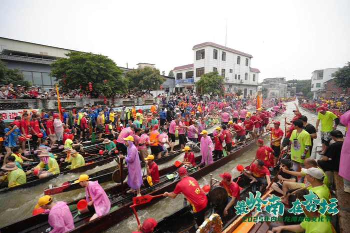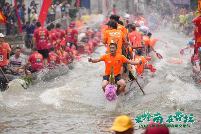 6月3日,“龙母诞”民俗活动正在佛山市顺德区杏坛镇龙潭村举行。其中,“百龙闹江”环节最为热闹,每年来自各地的彩龙参加龙舟巡游,“扒仔”们身着华丽的服饰,应着喧天的锣鼓声齐力划桨,鸣放鞭炮,相互泼水,将龙潭龙母诞推向高潮。