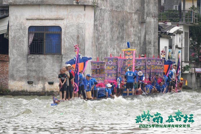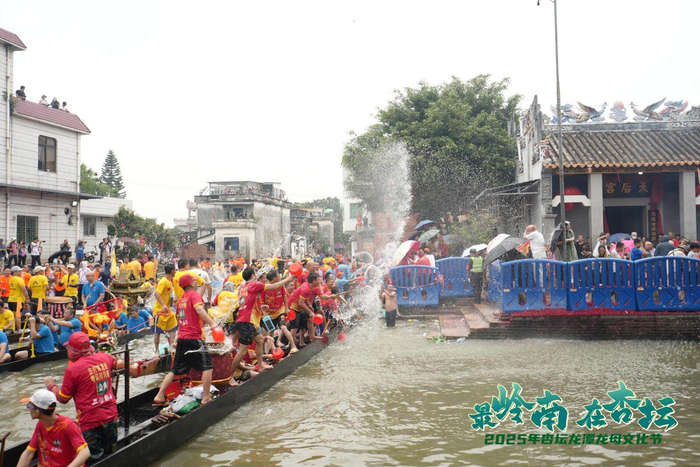 今年,有超过10万人次、148艘龙舟汇聚于龙母庙前水道,船上负载着罗伞、旗标、刻有村名或坊名的龙牌等极具民俗信息的装饰,水上来回穿梭、互相泼水送祝福。这使得龙潭继续成为端午期间整个顺德最热闹最欢乐的地方之一。