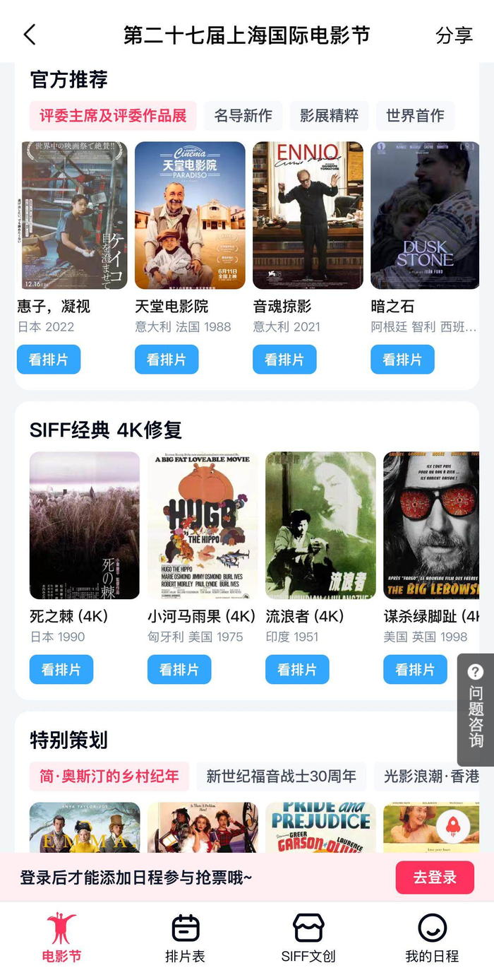 6月3日晚,第二十七届上海国际电影节展映排片表上线,并将于明天(6月5日)12时线上开票,14时线下开售。