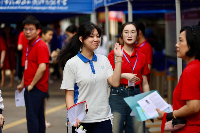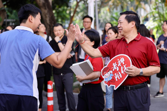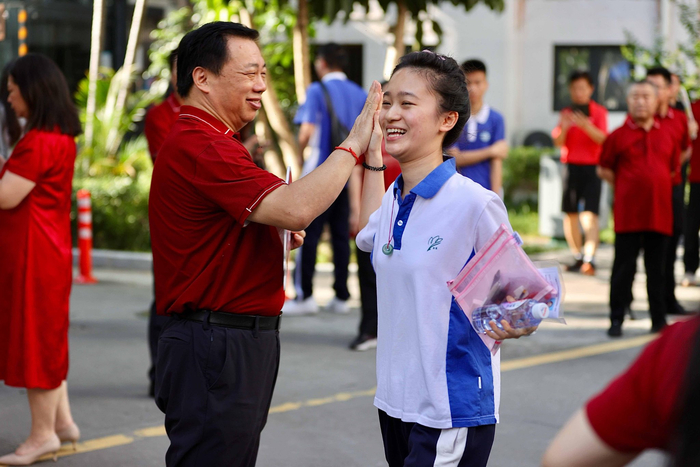 考生和老师击掌后进入考场记者了解到,在高考规范要求范围内,深圳市第一职业技术学校尽可能给特殊群体予以人文关怀。