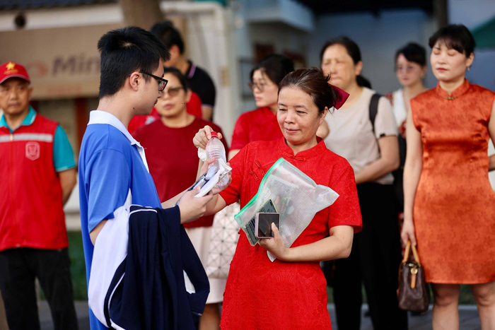 家长身着祝福话语的T恤为考生加油记者看到不少前来送考的家长有的身着鲜艳的红色衣服,寓意着“开门红”;有的家长与孩子轻声交谈,互相鼓励,试图用轻松的话语帮助孩子缓解内心的压力。