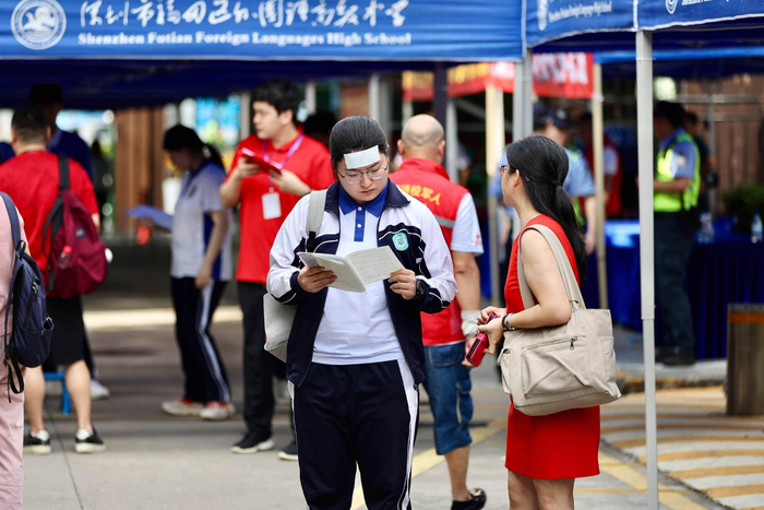 考生头戴冰凉贴为自己降温为给考生营造温馨、舒适的考试环境,深圳市招考办发布《你我共赴,同心护航高考——致全体市民的一份倡议书》,呼吁市民为高考按下“静音键”、推崇“正能量”,以实际行动为考生助力。有关考点也为相关考生提供使用盲文试卷、使用大字号试卷、佩戴人工耳蜗或助听器、优先进入考点考场等便利措施,加强对特殊群体考生的服务保障。