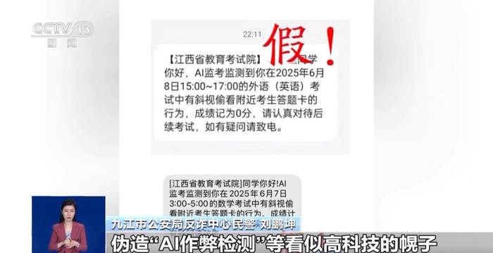 九江市公安局反诈中心民警刘鹏坤对此表示:“这是一种典型的冒充公检法或政府部门的诈骗手段。诈骗分子利用考生等待成绩时的焦虑心理,伪造“AI作弊检测”等看似高科技的幌子,发送带有恐吓性质的短信。”