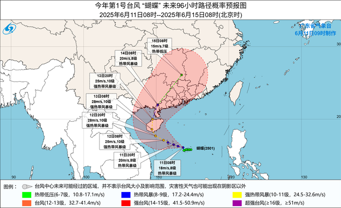 广东省气象台6月11日上午对“蝴蝶”路径和强度的预报广东预警范围在扩大,级别在提升