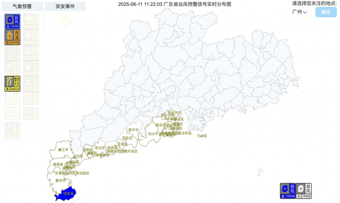 在“蝴蝶”正式生成之际,广东对“蝴蝶”的预警也在升级且范围扩大。截至11日11时22分,广东台风预警信号发布范围已从粤西逐渐拓展至珠江口以西,东起中山、珠海一带,西至徐闻的广东沿海地区均已发布台风白色或以上预警信号,其中徐闻率先发布更高一级的台风蓝色预警信号。