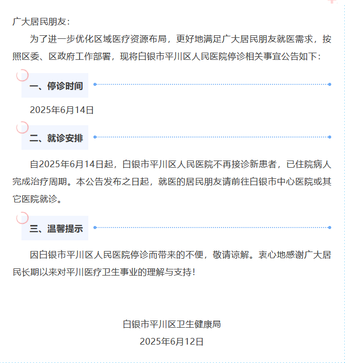 6月12日,甘肃省白银市平川区卫生健康局发布《白银市平川区人民医院停诊公告》: