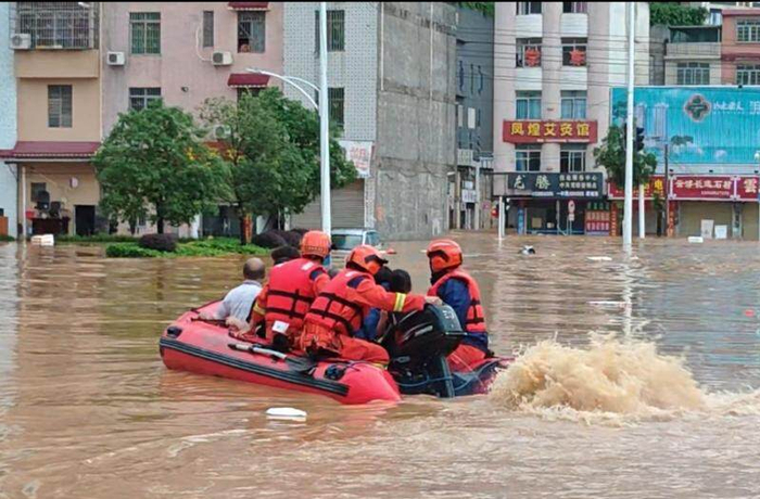 6月17日11时,广东省水文部门发布绥江怀集段洪水红色预警。受强降雨影响,绥江怀集站水位复涨,涨幅较大,一些商铺被淹,路面积水导致车辆被困,水深最深处达到2米。消防救援人员根据现场情况,立即携带橡皮艇、救生衣等装备前往救援。