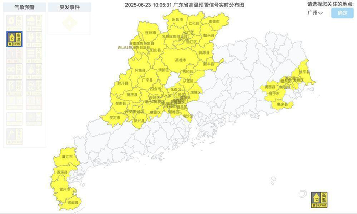 截至23日10时05分,广东高温预警信号发布情况 广东气象网截图在广东,当“龙舟水”退却后,高温预警信号已自6月21日起陆续发布。截至6月23日10时05分,广东有60个市县区发布高温黄色预警信号,包括湛江、云浮、肇庆、佛山、广州、清远、韶关、揭阳、潮州等地。在广州,高温黄色预警信号已自23日8时30分起在各区陆续发布。