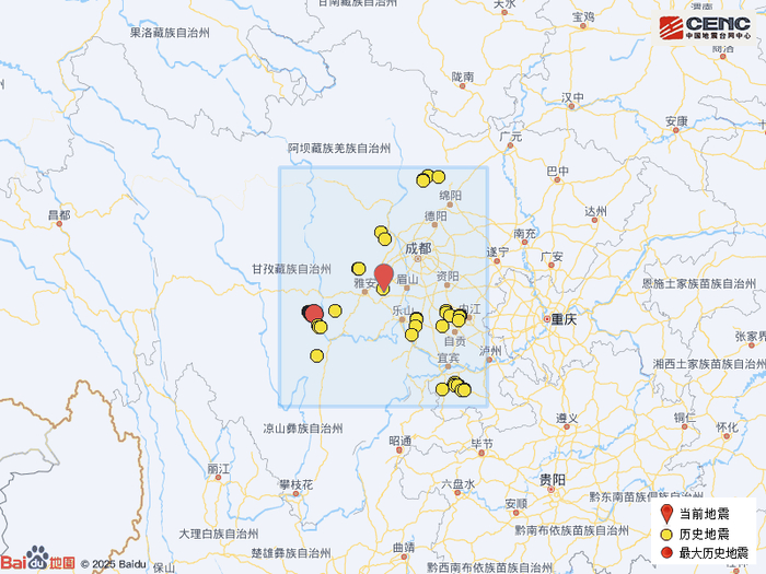 历史地震:根据中国地震台网速报目录,震中周边200公里内近5年来发生3级以上地震共201次,最大地震是2022年9月5日在四川甘孜州泸定县发生的6.8级地震(距离本次震中141公里),按震级大小前50次历史地震分布如图。