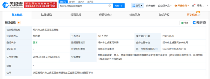 根据公开信息,2022年6月,道禄作为法定代表人在上虞区民政局注册登记了民办非企业单位“绍兴市上虞区莲花慈善社”,业务范围是开展弱势儿童、孤儿、单亲困难孕妇救助等慈善活动和慈善文化交流。该机构住所地址位于上虞区百官街道百草寺。