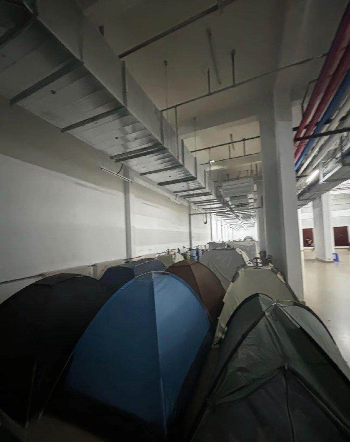 学生们在吉林大学前卫南区宿舍楼地下室支帐篷过夜。受访者供图6月26日下午,记者拨通校园服务热线反映此情况,工作人员表示将提供绿豆汤等避暑食物,“我们也很热。”