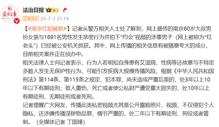 记者从警方相关人士处了解到,网上盛传的南京60岁大叔男扮女装与1691名男性发生亲密行为并拍下“约会”视频的涉事男子(网上被称为“红老头”)已经被公安机关抓获。其中,网上传播的相关信息有被随意夸大的成分,目前相关案件正在侦办中。