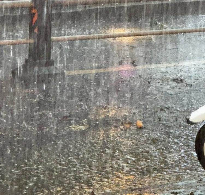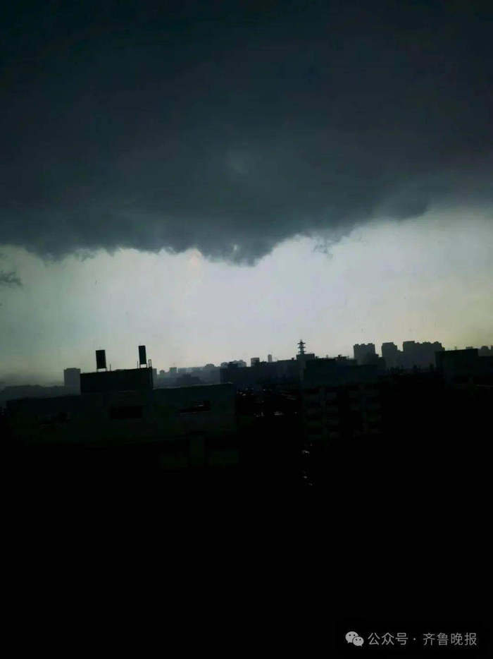 7日下午,济南天空瞬间乌云密布,下起瓢泼大雨,玻璃窗外大风卷着雨如瀑布一般。不少网友表示,“瞬间天黑!”