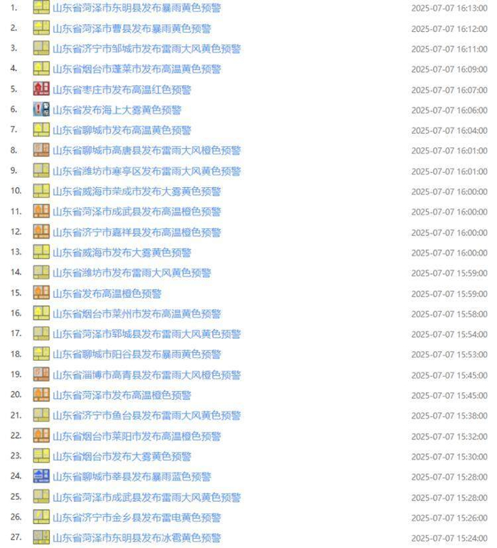 山东省气象台于7月7日14时40分发布强对流黄色预警:受副高边缘暖湿气流影响,预计7日下午到夜间,鲁西北、鲁中、鲁南和半岛北部地区将出现强对流天气,雷雨时伴有8~10级,局部11级以上雷雨大风,局部有冰雹和小时降水量50毫米以上的短时强降水。