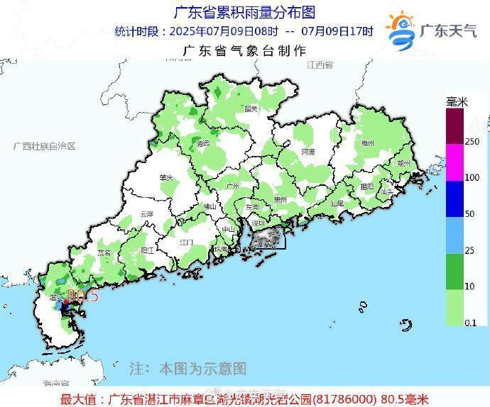 白天到底下了多少雨?据气象水文监测,7月9日08时到17时,各市雨量最大的镇街有:湛江麻章区湖光镇80.5毫米、惠州惠东县平海镇44.9毫米、深圳龙岗区葵涌街道35毫米、肇庆怀集县蓝钟镇31.1毫米、清远连州市大路边镇30.5毫米。