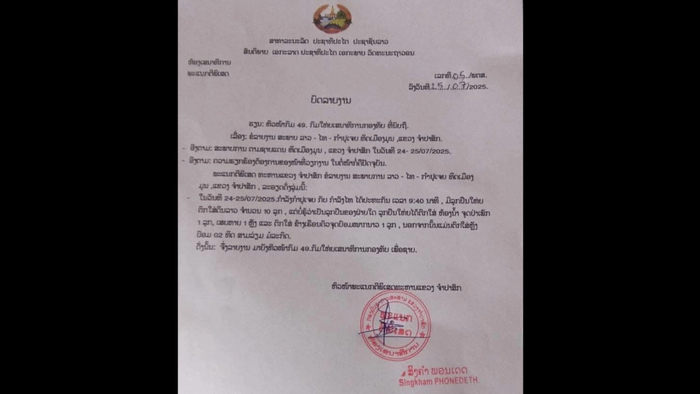 △老挝军方的通报文件老挝军方26日发布紧急通报称,老挝军队在老挝占巴色省与泰国乌汶府交界地区,与数名非法越境的柬埔寨武装分子爆发激烈交火,拘捕10人并缴获武器。
