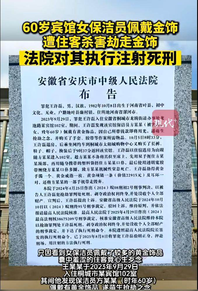 安庆市中级人民法院日前发布的一则布告显示,王某某于2023年9月29日入住桐城市某宾馆,其间他发现保洁员方某某(时年60岁)佩戴黄金饰品,便产生了抢劫念头。10月5日上午8点多,王某某退房,后乘坐网约车到桐城市区购买了长裤、鞋子、帽子,换装后返回该宾馆。王某某以住宿选房为由跟随方某某进入房间,趁方某某不备将其拉至床上,采用扼颈、塑料袋捂口鼻、透明宽胶带缠绕方某某口鼻多圈等方式,致方某某机械性窒息死亡。王某某劫得黄金手镯一个、黄金戒指一枚、黄金项链一条(价值22915元)及耳环一对,还将方某某的手机带走毁弃。