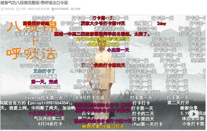 一段跟练视频收获超7000万的播放量,几万条打卡弹幕将画面层层遮住,短视频平台相关话题总播放量超84亿次……一千多岁的八段锦,又结结实实地“火”了一把!
