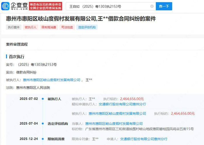 据悉,该起案件涉及惠州市惠阳区岐山度假村发展有限公司、王自如两个被执行人与交通银行股份有限公司惠州分行间借款合同纠纷,申请执行人为交通银行股份有限公司惠州分行。王自如与岐山度假村发展公司因此案被执行246万元。因王自如及关联公司未按执行通知履行法律文书确定的还款义务,法院依法对其采取限制消费措施。