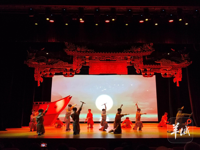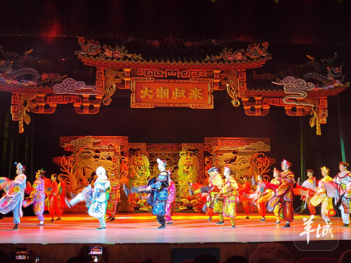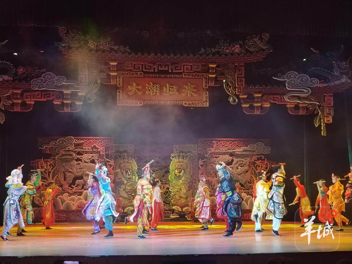 观看英歌舞舞台剧随后,到砲台镇观看大型舞台剧《大潮归来》。该剧是以英歌舞为文化核心创作的中国第一部英歌题材的剧院式全息幻境舞台剧,剧目以潮汕百年奋斗历程为脉络,分为“百年祠堂”“英歌有梦”“生死之交”“下南洋”“守护血脉”“四海归来”“英雄之歌”等篇章,通过舞蹈、戏剧、全息影像等手段,讲述潮汕人从下南洋到回归故土的故事,弘扬潮汕文化中坚韧、团结、爱国的精神内核。