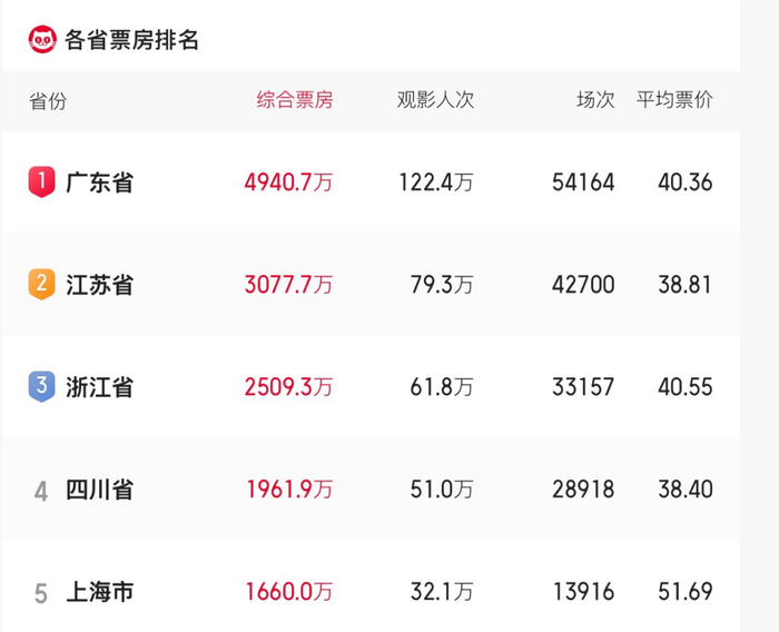 广东省、江苏省、浙江省分列当日省份票房冠亚季军。