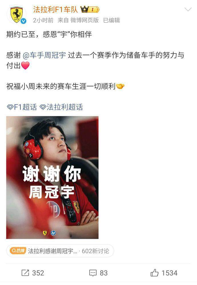 1月2日,法拉利F1车队发文告别周冠宇:期约已至,感恩“宇”你相伴。感谢周冠宇过去一个赛季作为储备车手的努力与付出。祝福小周未来的赛车生涯一切顺利。