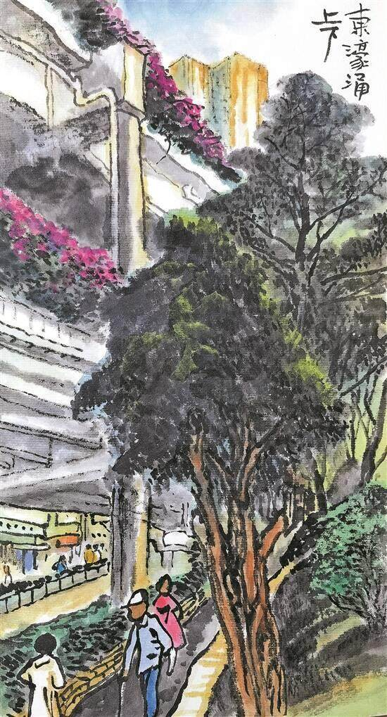 在广州生活了几十年,若不是常常车行于东濠涌高架路上,根本就不了解路底下有六百多年历史的东濠涌。看来这条几乎与河涌完全垂直重叠的高架路除了交通上的便捷,还有城市历史向导的功能。今天我借着写生的机会,第一次踏进了东濠涌博物馆,长了不少知识。而行走在河涌的两岸,抬头望向高架路的底部,要说视觉上除了压迫感还有什么,那便是两旁的树丛花木点缀在钢筋水泥构成的几何块之间形成的对比,它意味着我们的当代生活总是要面对发展所形成的种种矛盾,但人们无论如何都不会放弃亲近自然。所以,造福于市民的河涌改造成为了建造博物馆的起因和主题,馆内虽然只字未提河涌上面的高架路,但眼前的景象却体现出它们的共生关系。我提笔写生,实在拿捏不准究竟是应该画河涌还是画高架路:现在的河涌整治得像一个水上公园,似乎不太适合画家喜欢猎奇的观察趣味;而未整治前的所谓变化和丰富性,其实是以牺牲人们的生活质量为代价的。想清楚了这一点,对景写生就不会有什么纠结,无非见啥画啥,这可是我开专栏以来第一次这么做。我不能总是凭想象、靠记忆,也还得带着学习的态度走进自己说不清是熟悉还是陌生的城市。