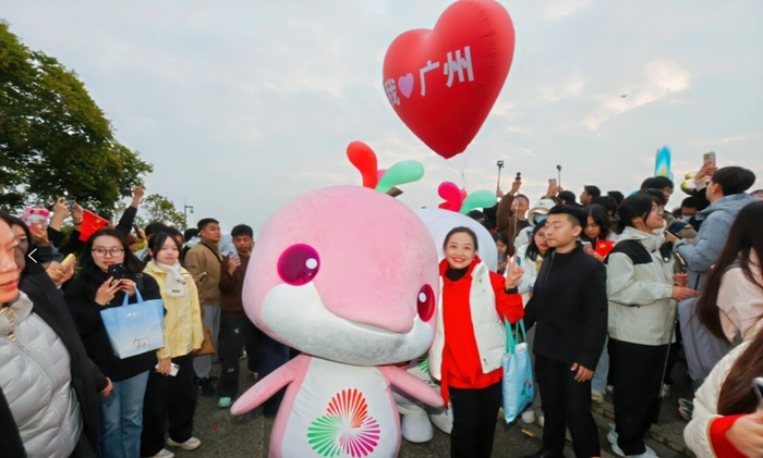 摩星岭上,市民与十五运会吉祥物一起登高迎新白云湖公园、广州市儿童公园也以其亲水、亲子的休闲特质,分别吸引了超14.85万和13.73万人次游园。