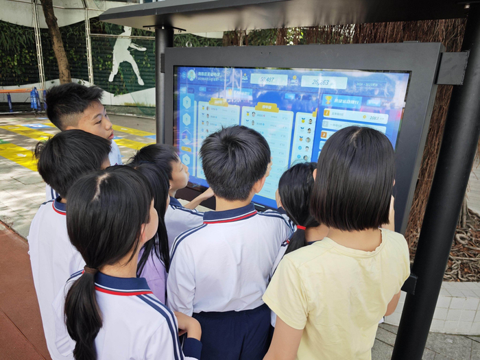 海实校园的体育教学环境已经“脱胎换骨”。AI体育锻炼测试屏如同一位不知疲倦的“智能教练”,支持50米跑、跳绳等多项测试,能自动识别违规动作,提供视频回放和个性化诊断。校级数据大屏则像“荣誉竞技场”,实时滚动各项目的运动排行榜,激励孩子们你追我赶。