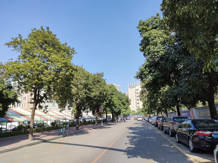 社区车辆整齐停靠在路边停车位