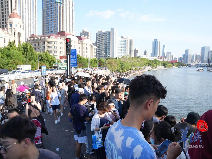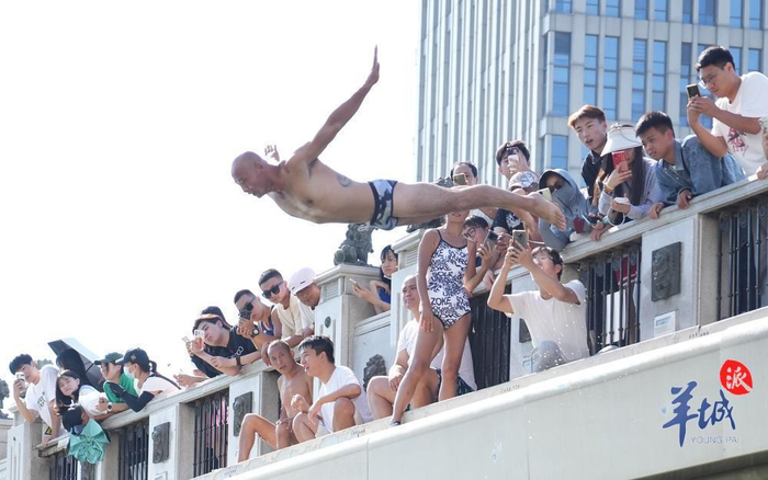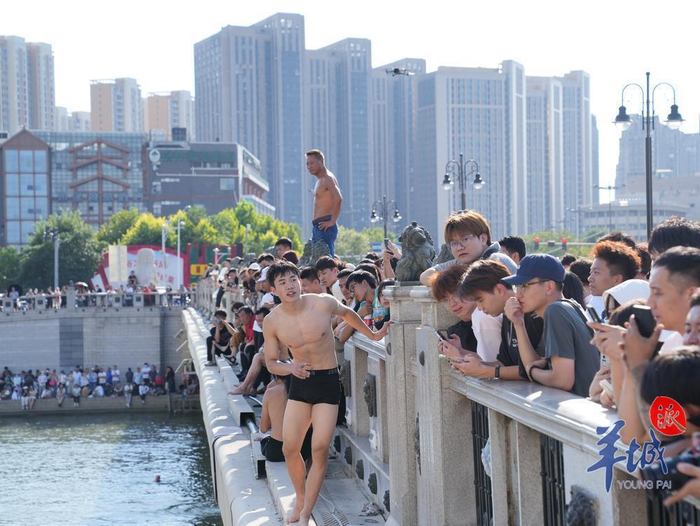 当羊城晚报记者到达海河上的狮子林桥时,正值下午2点,是一天当中最热的时候。但桥上以及海河两岸仍站满观众与蓄势待发的挑战者,更有许多游客拖着行李箱从火车站直奔这里,只为一睹“天津局部下伯伯”的盛况。