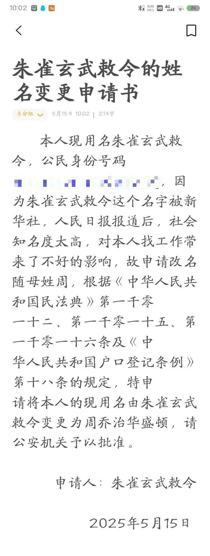 “朱雀玄武敕令”出生于2001年,父母为他起名“朱云飞”。2024年5月,他自己申请改名为“朱雀玄武”;2025年1月,他又改名为“朱雀玄武敕令”,即现用名。此后他又多次申请改名均未成功,其中一次申请变更的姓名有48个字。