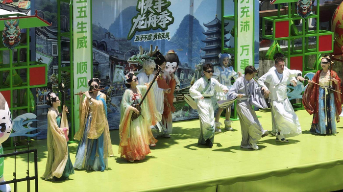 现场创意演出在龙舟竞渡观众入口处,相关展区集中展示望牛墩本地10余家企业的特色名优产品,让文化盛会与产业风采交相辉映。精心打造的“端阳集市”成为文商旅融合的欢乐嘉年华,集市汇聚50多家摊位,涵盖水乡特色美食、时尚轻食茶饮以及趣味互动游戏等,让市民“一站式”实现“好看、好逛、好吃、好玩”。游戏互动区的划船机体验、趣味投射、幸运抽奖等活动吸引众多参与者,身着哪吒、敖丙等神话角色服饰的Coser穿梭其中,舞龙舞狮队伍腾跃翻滚,与游客热情互动,将节日氛围不断推向高潮。