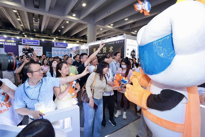 观众与“光小明”互动,现场气氛热烈从形象上看,“光小明”刻画了“全场景照明技术先行者”的生动形象。“光小明”传承佛山醒狮的勇猛、智慧,头顶南狮特有的鳌头,寓意技术佛照“独占鳌头”的领航者姿态;燎旺MDL智能交互屏,是其帅气的面庞;六大核心技术标识,在胸前闪耀;系上“大晟”同款披风,践行FAITH经营理念;戴上光能智控手套,智慧灯带为光能服注入动能。