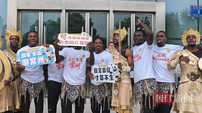 21日下午,记者看到,常州当地一家野生动物世界的非洲演员到场为常州队助威,他们在场外载歌载舞,高喊:“常州加油,常州进球,今晚吃鸭!”