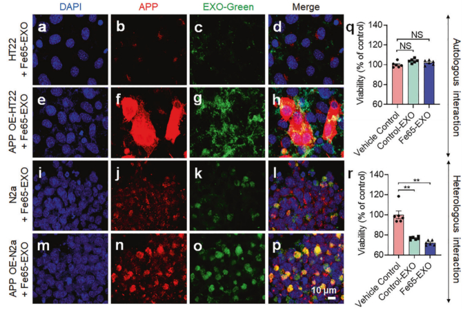 Fe65修饰的HT22海马神经元细胞源性外体(Fe65-EXO)装载了Cory-B (Fe65-EXO-Cory-B),劫持了信号通路并阻断了Fe65与APP之间的自然相互作用,从而实现了Cory-B的APP靶向递送。值得注意的是,Fe65-EXO-Cory-B诱导表达APP的神经元细胞自噬,从而改善AD小鼠的认知能力下降和发病机制,这表明Fe65-EXO-Cory-B可能是一种有效的AD治疗干预手段。