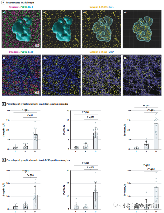 本文所包括的痴呆和适应性大脑中小胶质细胞和星形胶质细胞的促炎性和稳态标记物的详细分析发表在其他地方。Iba 1阳性阿米巴样小胶质细胞内突触点的定量(突触前点状神经元的平均值[SD]为7.7%[2.8%] vs 1.7% [1.2%] vs 1.0% [0.7%]; P (图2)。