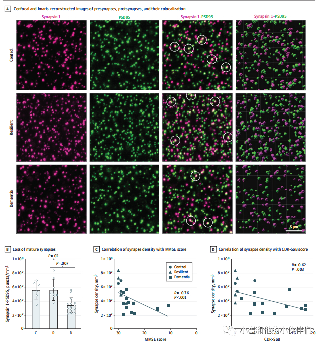 评估痴呆和适应性大脑中多个区域Aβ斑块和NFT负荷的详细定量程序先前已在其他地方发表。Aβ斑块沉积物的负荷,定义为4G 8抗体标记的A β斑块占据的皮质面积(平均值[SD],1.5%[1.7%] vs 2.9%[3.7%];P = 0.60)和神经纤维,定义为AT 8抗体标记的神经突(平均值[SD],0.004%[0.008%]vs0.003%[0.0025%]; P = 0.50)在痴呆大脑和适应性大脑之间的视觉皮层中没有显著差异。正如在Braak III至IV阶段所预期的那样,在适应性大脑或痴呆大脑的视觉皮层中不存在NFT。患有痴呆症的大脑显示出比适应性大脑和对照组大脑更高的血管综合评分。与先前的结果一致,与适应性(168 [165])和对照组(76 [87]; P = 0.001)相比,痴呆患者大脑中每平方毫米γH2AX阳性细胞的平均[SD]数量(508[461])显著增加。与对照组和适应性组的视觉皮层相比,痴呆症组的脑组织中突触前密度下降43%,突触后密度降低33%,突触前和突触后共定位的密度降低38%(图1)。当分析仅限于原发性年龄相关性tau蛋白病患者的较小亚组时,发现了类似的差异,表明无论是否存在A β斑块,在无NFT沉积的情况下,痴呆患者大脑视觉皮层的早期突触丢失都发生了。研究的大脑显示成熟突触的平均(SD)密度为5.6 × 107(1.5 × 107)为适应性脑,3.4× 107(1.05 × 107)为痴呆脑,而原发性年龄相关性tau蛋白病病例亚组的平均(SD)突触密度与5.2 × 107(6.4 × 106)的突触密度相当,原发性年龄相关性tau蛋白病伴痴呆组为3.6 × 107(1.0 × 107),对照组为5.5 × 109/mm3。在之前的研究中,对照组大脑中共定位的成熟点状神经元约占所有点状神经元的65%。在成熟点状神经元和临终前临床痴呆评分-Sum of Boxes之间检测到显著相关性(R =-0.62;P =0 .003),简易精神状态检查评分(R =-0.76;P