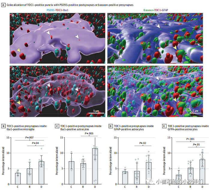 作者通过Iba1阳性阿米巴样小胶质细胞和GFAP阳性星形胶质细胞对10个代表性病例(4个痴呆脑; 4个与Aβ斑块、神经纤维缠结和血管负荷匹配的适应性脑; 2个对照脑)中内化的TOC 1阳性和巴松阳性突触前点以及TOC 1阳性和PSD 95阳性突触后点的比例进行了量化。作者发现在Iba 1阳性的阿米巴样小胶质细胞中,(痴呆组与对照组:7.4% [1.8%] vs 5.1% [1.9%] vs 3.7% [0.8%]; P = 0.006,对于内化TOC1阳性和巴松阳性斑点; 11.6%[3.6%]vs 6.8% [1.3%] vs 7.4% [2.5%]; P = 0.001,对于内化的TOC 1阳性和PSD 95阳性斑点)和GFAP阳性星形胶质细胞(痴呆组与对照组:7.0%[2.1%]vs4.3%[2.6%] vs4.0%[0.7%];P = 0.001,对于内化TOC1阳性和巴松阳性斑点;7.9%[2.2%]vs5.3%[1.8%]vs3.0%[1.5%];P = 0.001,对于内化的痴呆大脑中TOC 1阳性和PSD 95阳性斑点;与适应性大脑相比(图4)。在痴呆患者的脑中,含tau寡聚体的突触点占被小胶质细胞和星形胶质细胞吞噬的总突触点的很大比例(在Iba1阳性的阿米巴样小胶质细胞中,91%的突触前点和93%的突触后点,在GFAP阳性的星形胶质细胞中,63%的突触前点和60%的突触后点),表明含tau寡聚体的突触元件优先被这些脑中吞噬。