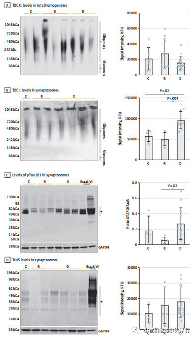 作者评估了早期tau蛋白过度磷酸化位点,(AT 270/ pTau [Thr 181]、pTau 217 [Thr 217]和AT 180/pTau [Thr 231]),以及总tau(Tau 5)、N-末端tau(Tau 12)和C-末端tau(Tau 46)的水平。在痴呆患者脑内的突触体中,AT 270/Tau 5比值显著增加(中位数[范围],0.27 [0.14-0.40])与适应性组(中位数[范围],0.06 [0.007-0.10])和对照组相比。使用充分表征的抗体TOC 1测量整个组织匀浆和突触体富集部分中的Tau寡聚体。总匀浆中TOC 1的信号强度水平在三组之间没有显著差异,但痴呆患者的大脑中包含显著更高的TOC 1强度(中位数[范围],96147 [82963-109330]相对荧光单位[RFU])(图3)。
