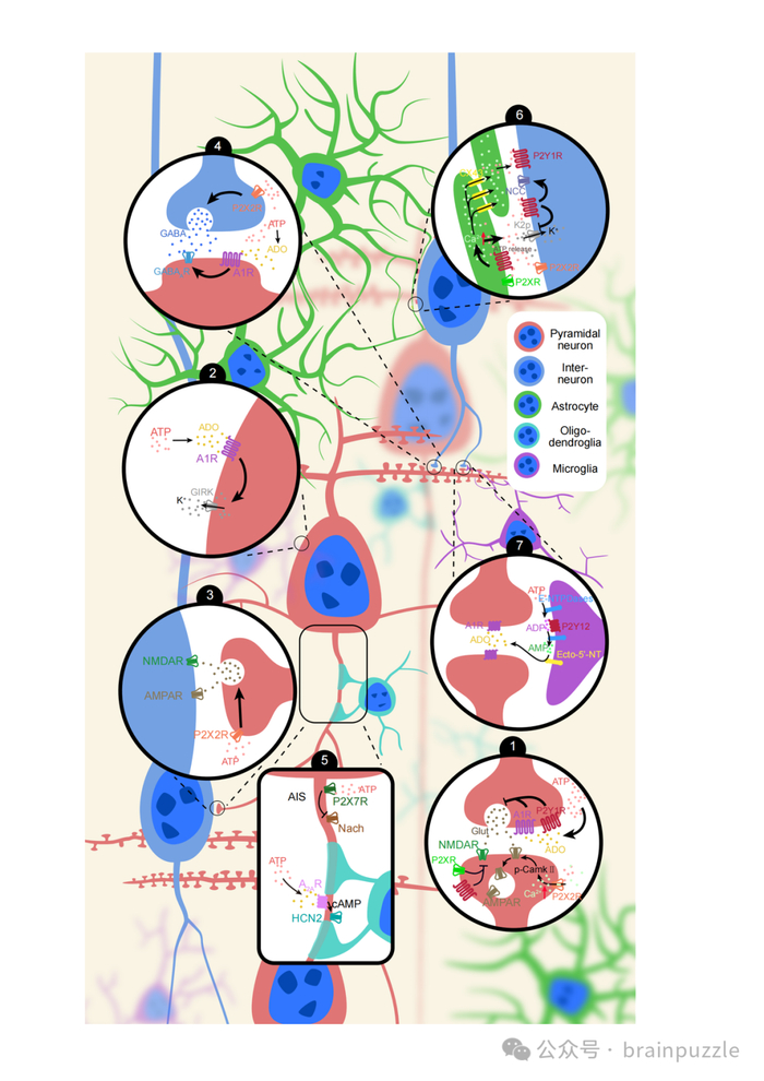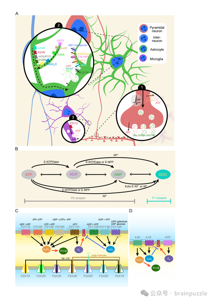 图1 嘌呤能系统的原理图2.细胞外ATP作为一种内稳态信使调节了神经元的活动和大脑环路