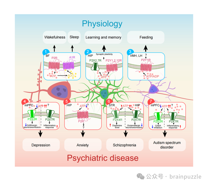 细胞外ATP在协调大脑神经元活动中起着关键作用,并参与了各种生理过程,包括睡眠和觉醒,学习和记忆,以及摄食(图3)。