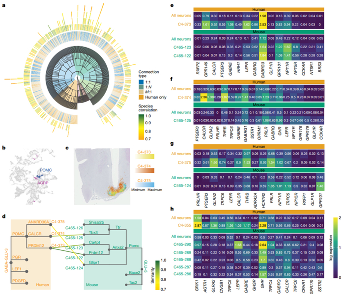 POMC 神经元的空间分布和跨物种差异:人类下丘脑的 POMC 神经元存在多个亚群,它们在弓状核(ARC)呈现出不同的空间分布。并且,人类和小鼠的 POMC 神经元在转录组身份上存在差异,尤其体现在特定受体基因的表达上。这种差异可能导致两个物种在食欲调节、能量代谢等生理过程中,POMC 神经元发挥功能的方式有所不同,对开发针对人类的肥胖治疗策略有重要启示。