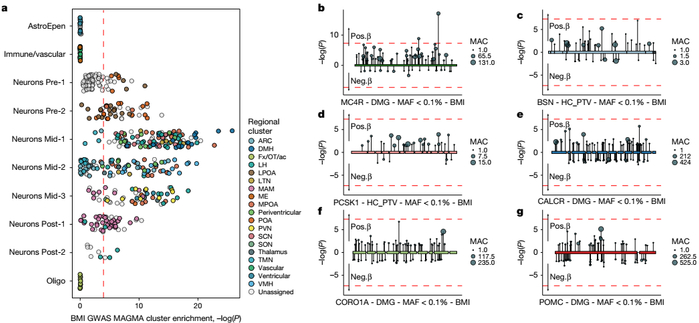 鉴定出影响 BMI 的关键 “效应基因”:研究确定了 426 个 “效应基因”,这些基因对细胞类型特异性高且在 GWAS 数据关联中靠前。对英国生物银行(UK Biobank)的外显子测序数据分析发现,426 个基因中有 6 个基因的罕见有害变异与 BMI 变化显著相关。这 6 个基因包括已明确与肥胖相关的 MC4R、PCSK1、POMC、CALCR,还有新发现的 BSN 和 CORO1A。新基因的发现拓宽了对肥胖遗传机制的认知,为肥胖相关疾病的研究提供了新方向。
