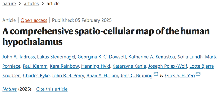 Tadross JA, Steuernagel L, Dowsett GKC, et al. A comprehensive spatio-cellular map of the human hypothalamus. Nature. Published online February 5, 2025. doi:10.1038/s41586-024-08504-8